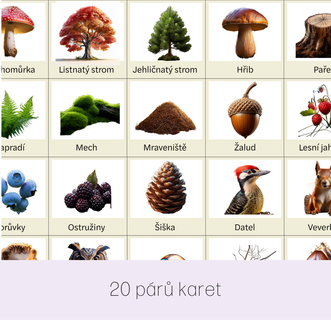 20 párů karet na téma les. Karty jsou vytištěné na čtvrtce a zalaminované, takže jsou odolné a vhodné i na hru v terénu při krácení volného času.