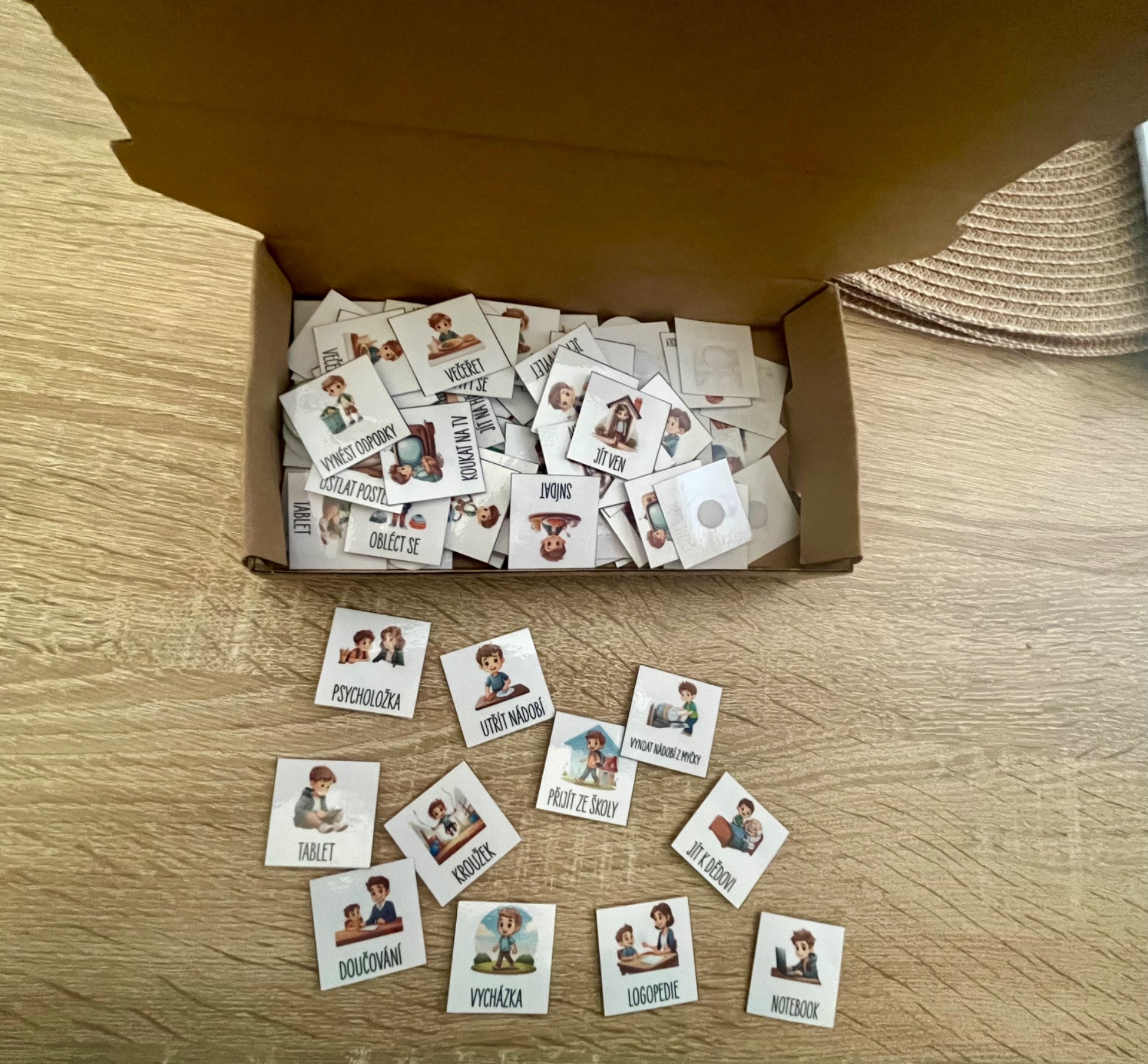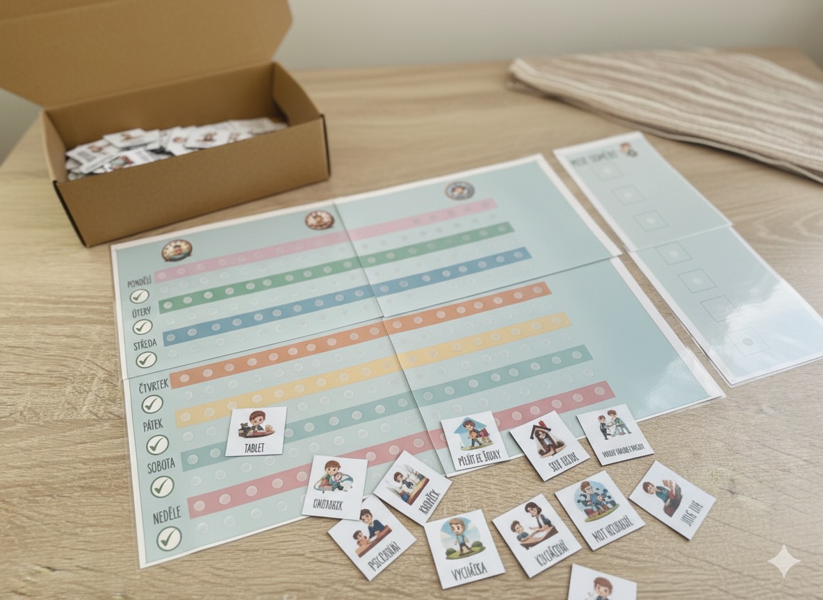 Představujeme vám našeho nepostradatelného pomocníka pro organizaci času a nastavení rutiny – Laminovaný týdenní režim s piktogramy a suchým zipem!